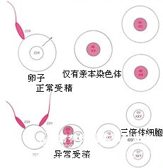 通过细胞遗传学结合病理学研究证明两类葡萄胎各有遗传学特点。完全性葡萄胎的染色体基因组是父系来源,即卵子在卵原核缺失或卵原核失活的情况下和精原核结合后发育形成。染色体核型为二倍体,其中90%为46,XX,由一个空卵(无基因物质卵)与一个单倍体精子(23,X)受精,经自身复制恢复为二倍体(46,XX),再生长发育而成,称为空卵受精。其少数核型为46,XY,这是两个性染色体不同的精子(23,X及23,Y)同时便空卵受精,称为双精子受精。部分性葡萄胎核型常是三倍体,80%为69,XXY,其余是69,XXX或69,XYY,来自一个正常卵子与双精子受精,由此带来一套多余的父方染色体成份;也可由于一个正常的单倍体卵子(或精子)与减数分裂失败的二倍体配子结合所致。