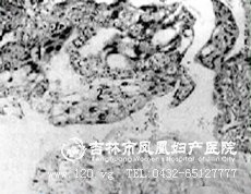 细胞滋养层细胞(郎罕细胞)位于正常绒毛内层,呈立方或多边形,胞浆淡染,核圆居中,染色质较稀疏。合体滋养层细胞位于正常绒毛的外层,细胞体积大而不规则,胞浆嗜酸呈深红色,多核,核深染。正常绒毛在妊娠3个月后,滋养层细胞仅剩合体滋养层细胞,而葡萄胎时这两种细胞皆持续存在,并活跃增生,失去正常排列,呈多层或成片聚集。
